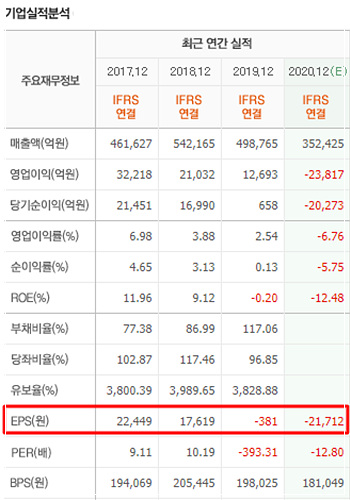 심지어 적자를 기록한 기업은 EPS가 마이너스로 나타나기도 합니다. SK이노베이션의 2020년 결산 추정치를 토대로 도출한 EPS는 -21,712원입니다.